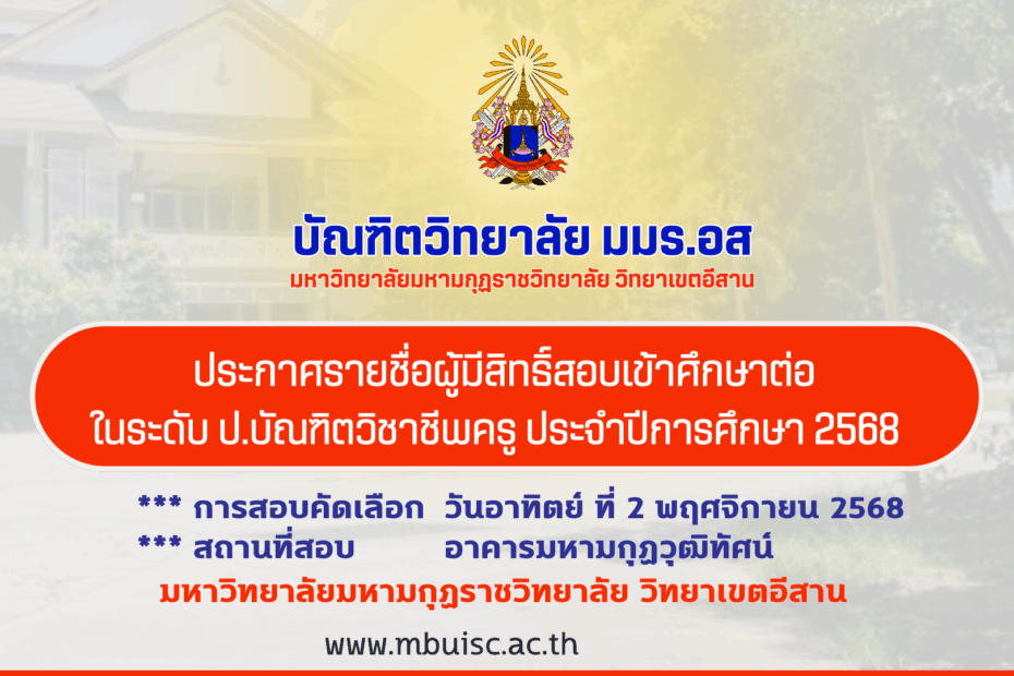 ประกาศบัณฑิตวิทยาลัย มหาวิทยาลัยมหามกุฏราชวิทยาลัย วิทยาเขตอีสาน เปิดรับสมัครบุคคล เพื่อคัดเลือกเข้าศึกษาในหลักสูตรปรัชญาดุษฎีบัณฑิต (ปร.ด.) สาขาวิชาวิจัยพุทธศาสตร์และปรัชญา (Doctor of Philosophy(Buddhist and Philosophical Research) ปีการศึกษา ๒๕๖๘ (ภาคการศึกษาที่ ๒) คลิกเพื่อสมัครเรียน ดูรายชื่อผู้สมัคร
